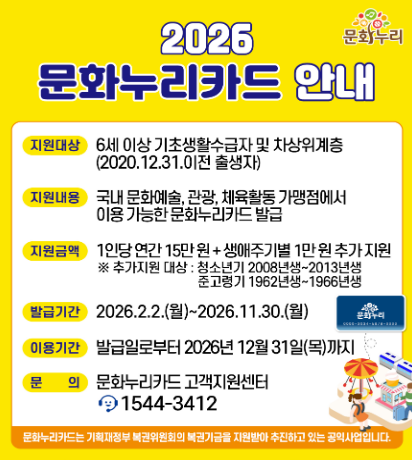 문화누리카드는 기초생활수급자와 차상위계층을 대상으로 문화예술, 관광, 체육 분야의 이용을 지원하는 통합문화이용권입니다.